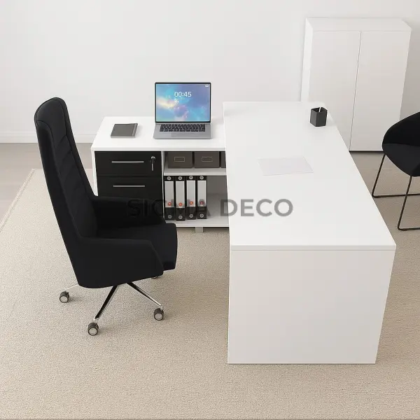 Optimisez votre espace de travail avec ce bureau d’angle blanc, doté de rangements intégrés. Son design moderne et sa surface spacieuse sont parfaits pour un environnement de bureau professionnel ou à domicile. Fonctionnel et élégant, il maximise votre productivité