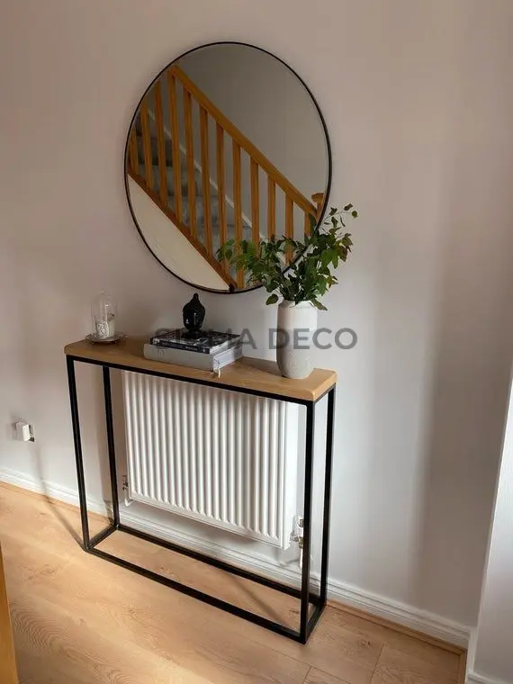 Console bois clair métal noir, miroir rond. Design industriel. Aménagement intérieur