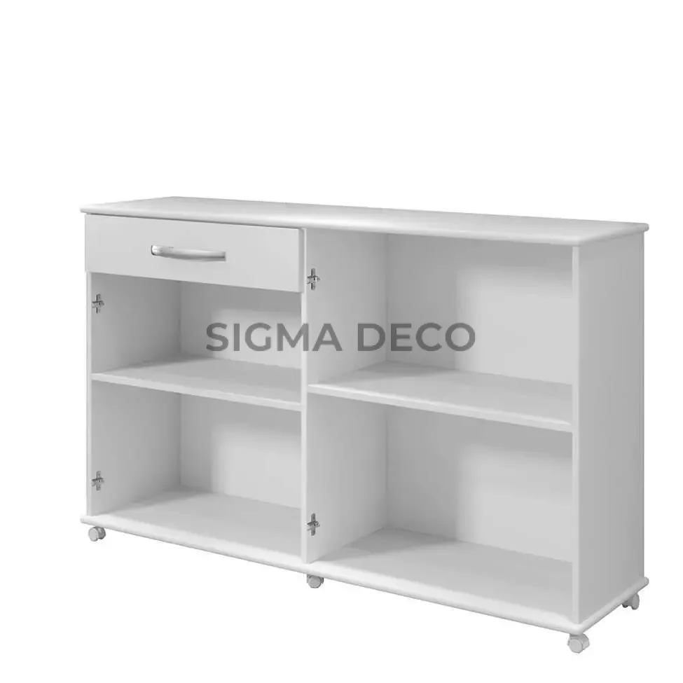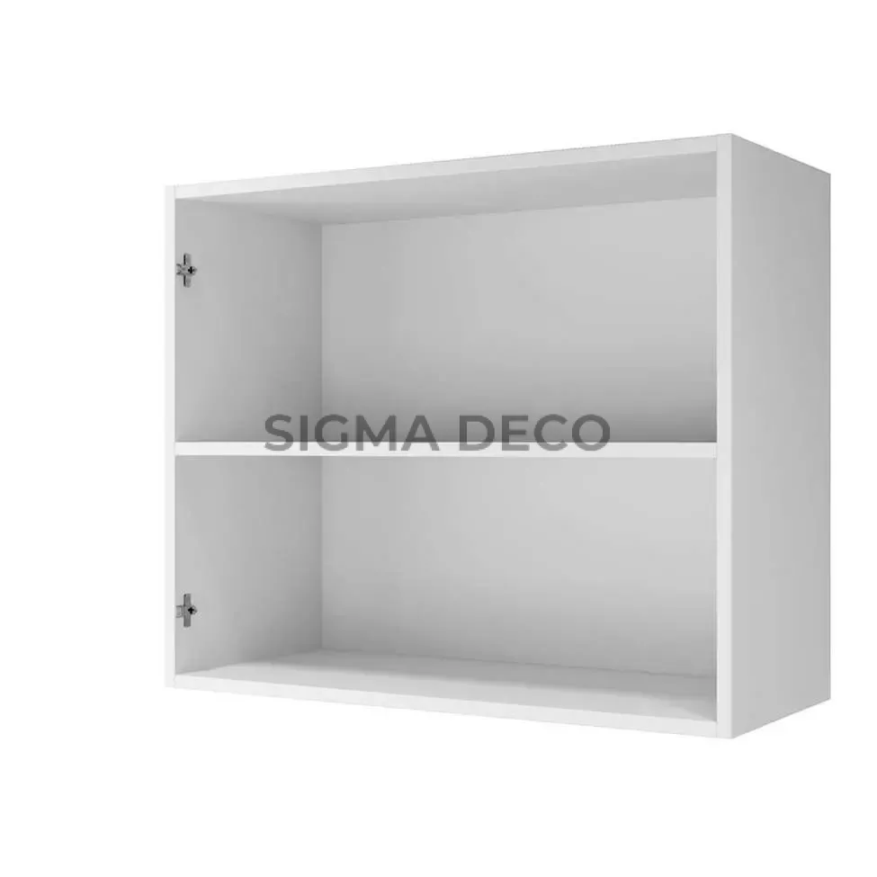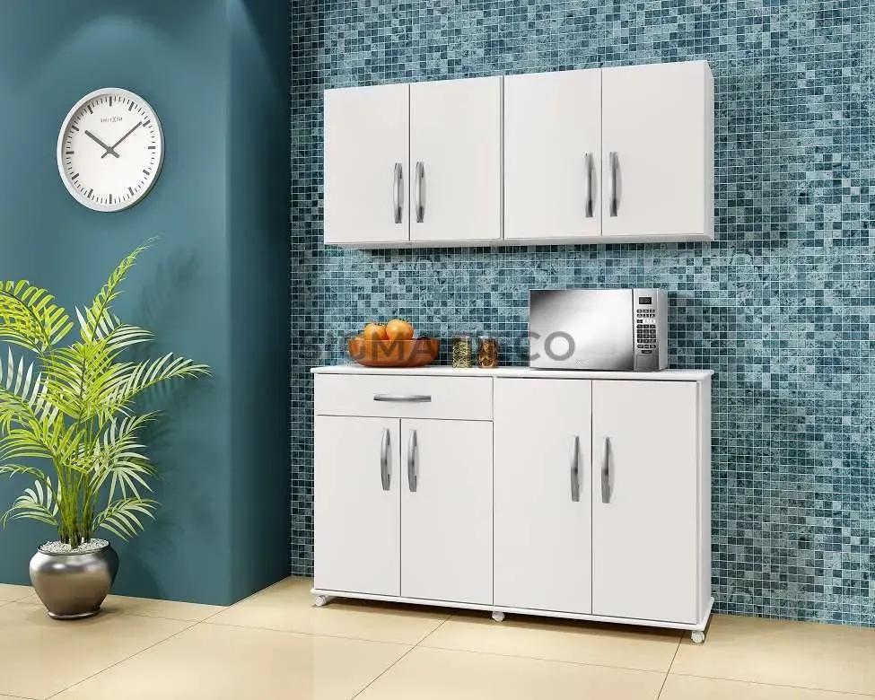 Meuble de cuisine blanc moderne avec placards muraux et meuble bas. Idéal pour micro-ondes. Rangement optimal et design élégant.