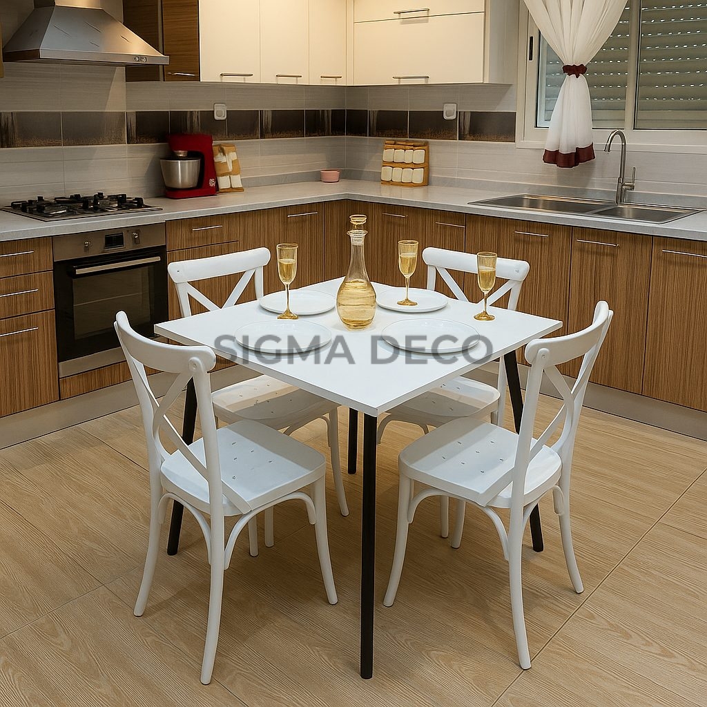 Ensemble Table Blanche Pieds Foncés et 4 Chaises Blanches – Contraste Élégant